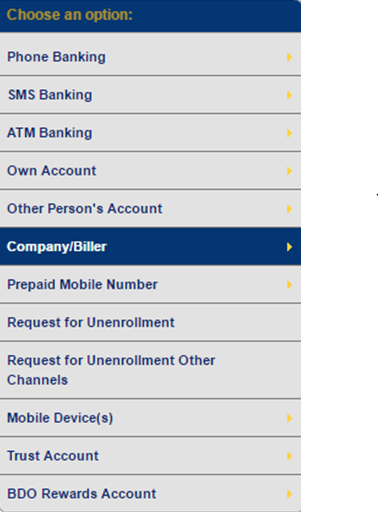 NOTE: If using the BDO Mobile App, please enroll first the Company/Biller via the BDO Online Banking website. DO NOT enroll the Company/Biller via the Mobile App as there is bug that is currently being fixed.